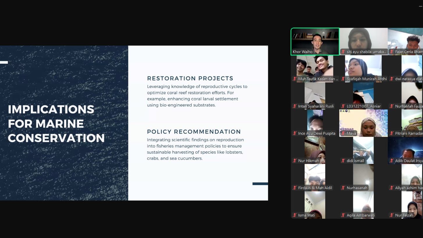 Rabu – 20 November 2024. Dr. Khor Wai Ho, merupakan dosen dari Universiti Malaysia Trengganu, Kuala Trengganu, Malaysia. Beliau merupakan pengajar sekaligus peneliti yang berfokus pada program studi Aquaculture dengan bidang keahlian pada Crustacean Brreding and Biotechnology, Larva Raring, dan Population Health.